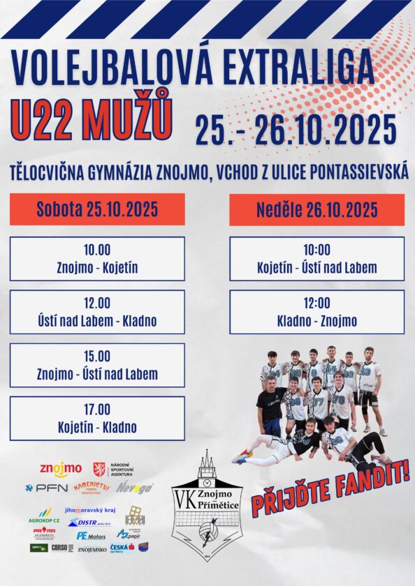 O víkendu 25.-26. října 2025 přivítá Znojmo Extraligů juniorů U22M. Přijďte podpořit znojemské juniory a podívat se na špičkový extraligový volejbal!!!